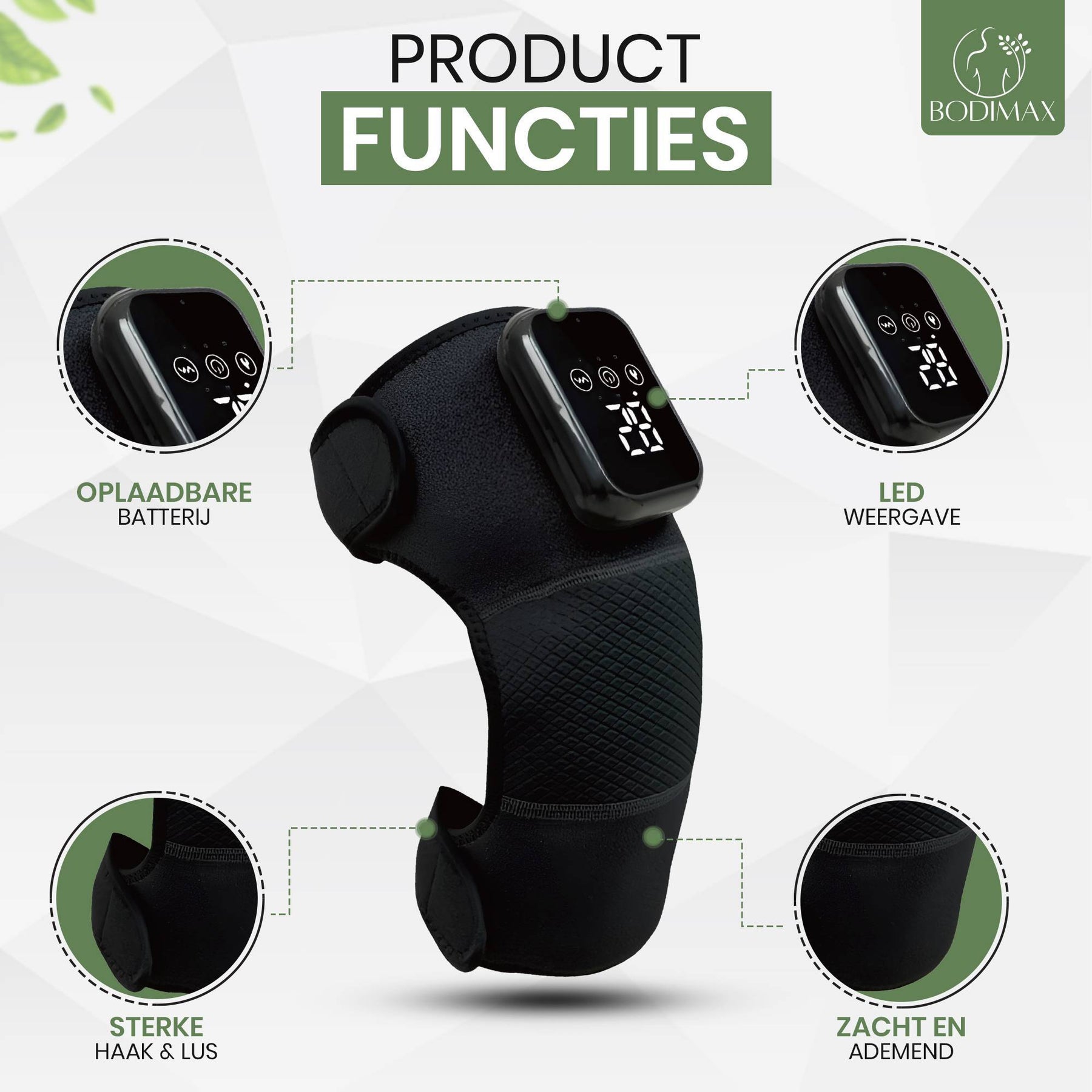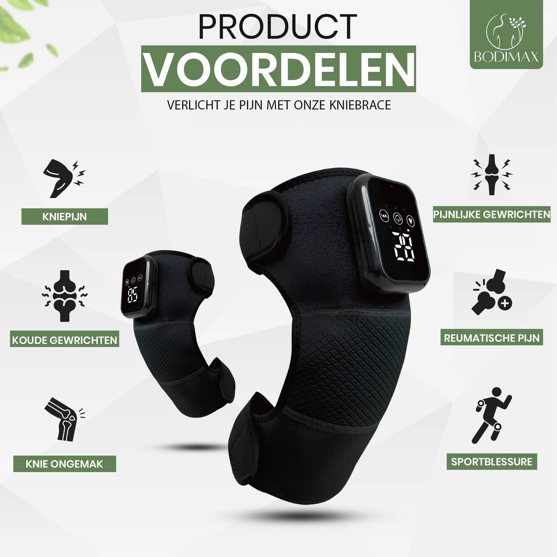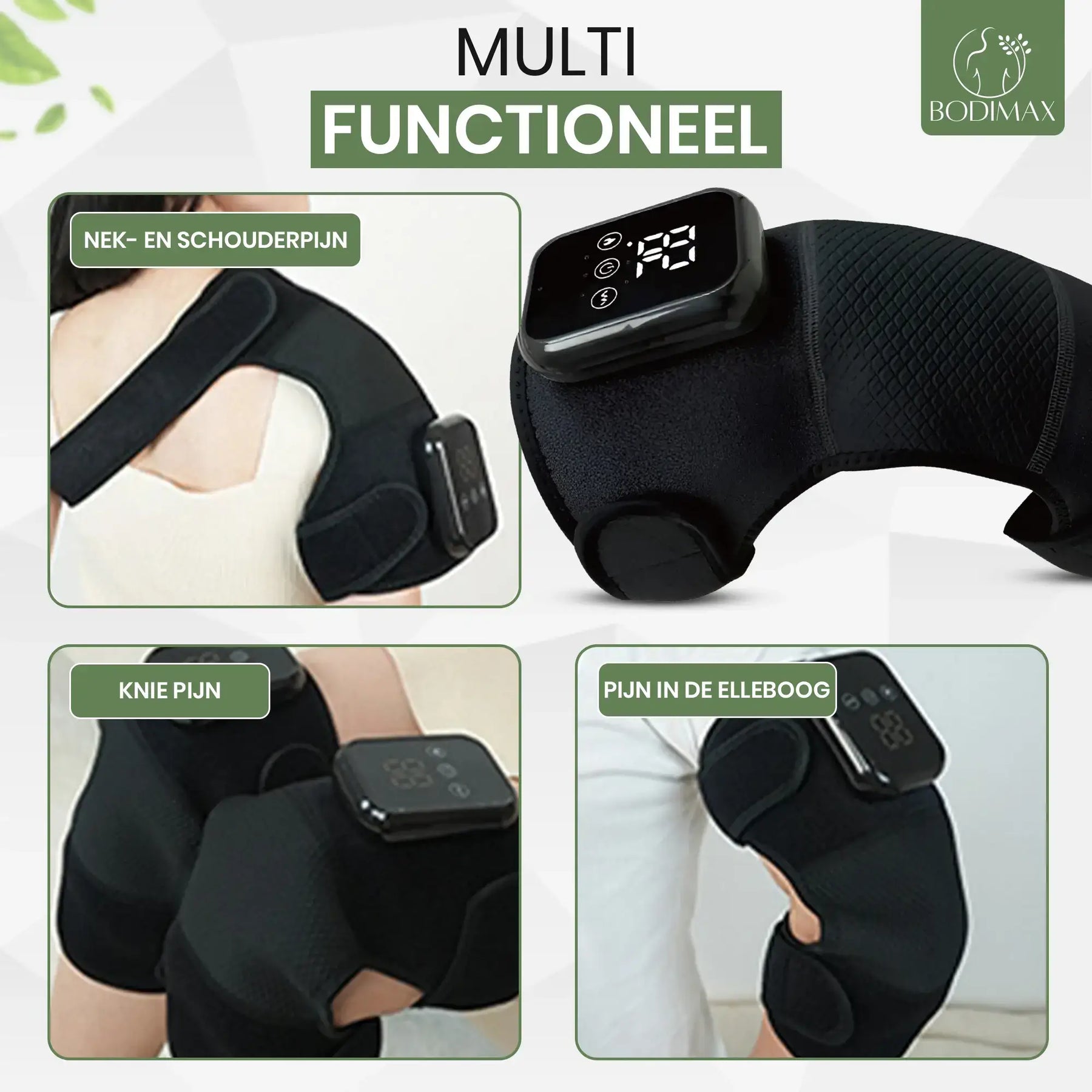 Waar crèmes snel uitwerken en braces vooral steunen, combineert dit warmte, massage en compressie als actieve thuistherapie vóór/na bewegen. Dat doorbreekt juist die “boink”-momenten bij starten.